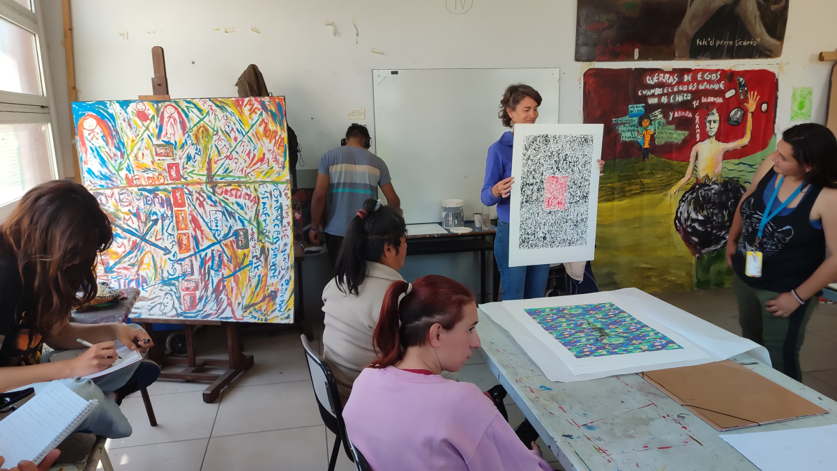 Con les talleristas de acá, hemos tenido la oportunidad de presentar el arte que se hace en Isauro, que hace los compañeros en muchos lugares, en muchas marchas, en muchas charlas, estuvo muy bueno poder plasmar de Isauro Arancibia hacia el exterior, lo que existe afuera el arte isaurino y entender que es una forma de expresión genuina (Entrevista a Alan, estudiante. Entrevistador: Pérez Solla. Fecha: 2024.
